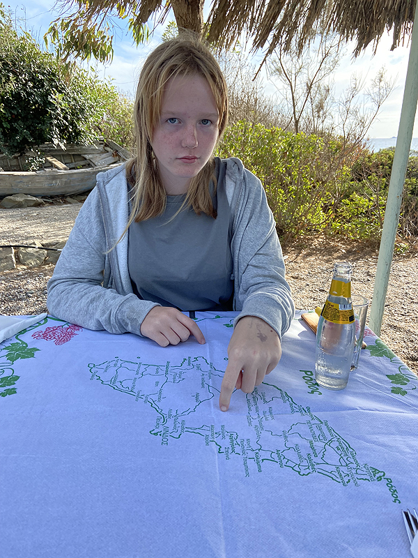 Pakrantės tavernoje stojam valgyti. Rašo, sea food, grill - mum tinka. Mokom vaikus geografijos, kol neša grilintus kalmarus ir graik. salotas užkandžiams. O paskui laukiam kokią valandą karštų - nejaugi mus pamiršo? Aplinka nuostabi - ant skardžio, matosi tas pats žydraiturkinis pliažas, po eukaliptais laksto driežai, o mes vis laukiam. Maistas puikus, tik dičkė nusivylė, kad mėsos padažo ant makaronų per mažai, anot padavėjos, jį čia taip ilgai gamino.