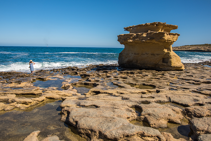 Xwejni pakrantė Gozo saloje su natūraliai susiformavusiais druskos koriais, juose jūros vbanduo išgaruoja, o lieka tik druska...