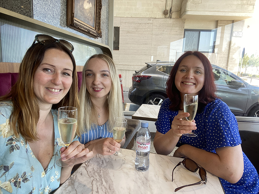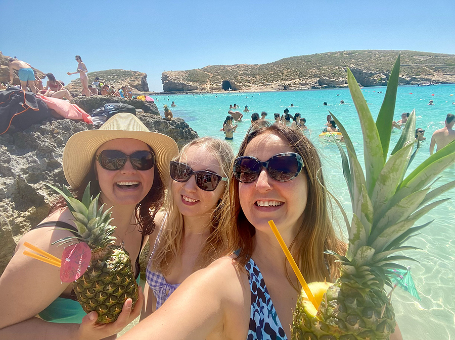 Kėliamės 4 ryto. Traukinys, lėktuvas, taksi Maltoje. atvarom į viešbutį. Registruojamės, rengiamės į lengvesnius rūbus - skrydis ankstyvas, dar kambario negauname, lagaminus paliekame saugoti ir ruošiamės varyt savo reikalais. Matau, ateina padavėjas su trim šampano taurėm 10 ryto. Sakau, va, kad taip čia mums. Ir jos buvo mums! Labai gerą viešbutį pasiėmėm, welcome drinkas, pusryčiai gausūs, gražus, su baseinu ant stogo, o kaina super gera.