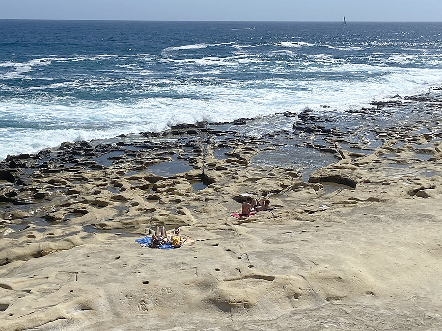 Prisėdame pailsėti. Po kojomis erozijos išgraužtos ertmės, vėl ir vėl pripildomos vandens užliejančių bangų.