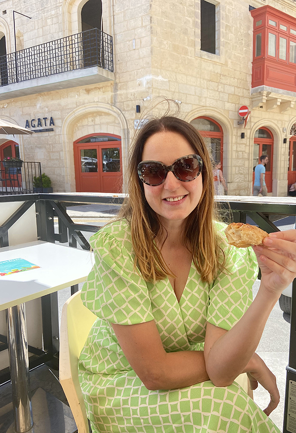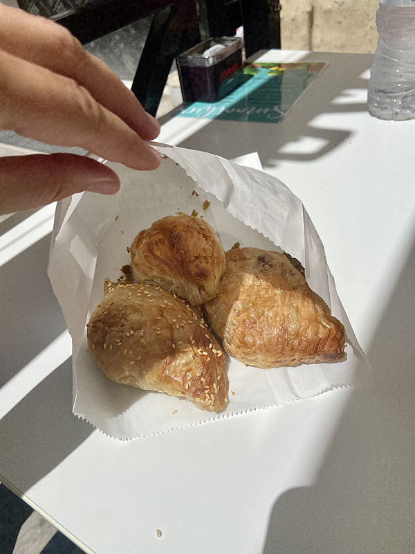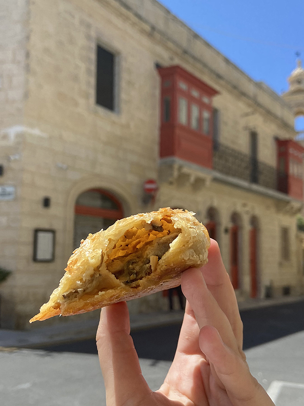 Pasirodo, tas maltietiškas sūrio pyragas yra sluoksniuotos tešlos pyragėlis su įvairiais įdarais - pupelėm, višta, sūriu. Skaniausi buvo su vištiena. Kaina šių pietų gavosi nereali - trys pyragėliai po 60-70cnt ir vandens buteliukas 0.5ltr 60cnt.