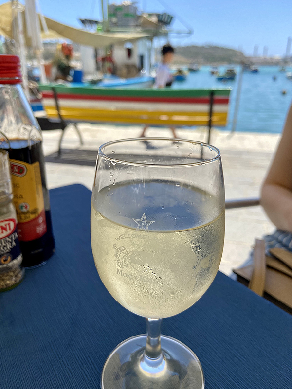 Prisėdam atsipūsti - čia vyno taurė maltietiškai. Ok. Matėm kituose baruose taurė vyno 1 eu buvo. Čia teko net visus 4eu pakloti.