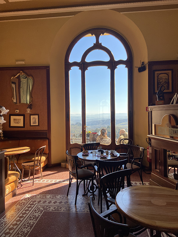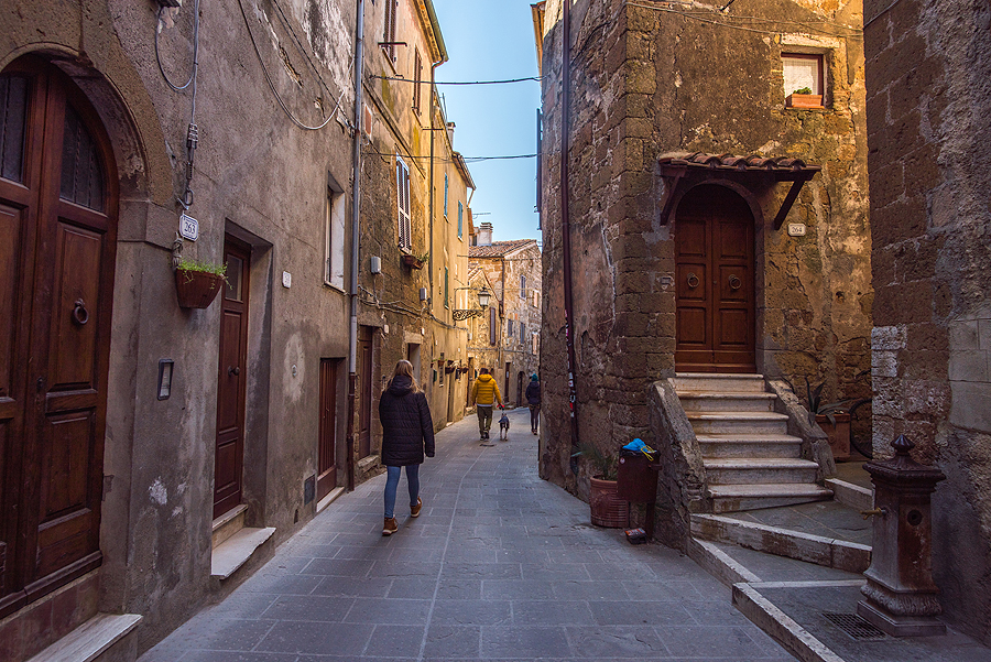 Kadangi vis dar šalta, skubiai apeinam visą miestelį pirmyn atgal, lipam laipteliais tarp gatvių, kylam į kalną vis, bet nuotaika visų gera. Užmatom parduotuvėlių fainų, vienos durys - desertų su sicilietiškais pyragiukais, kitos - vyno baras, vyras sako: "nu, tai ir marširuoji tarp abiejų pirmyn atgal".