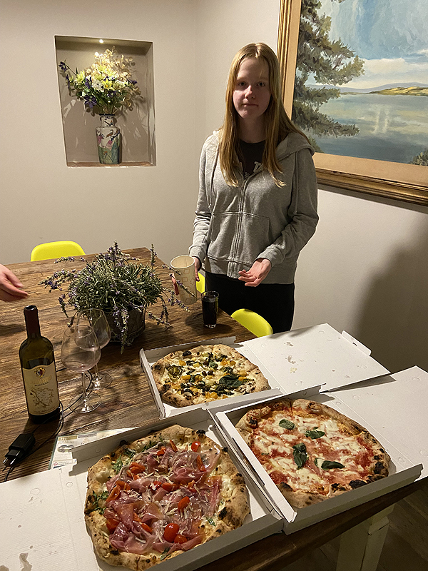 Jau vakaras, tamsu, po kelionės nesinori kažkur slampinėt ir ieškot ko valgomo, tad greit googlemaps susirandam piceriją. Picas užsakom išsinešimui, po kelių min paklausiam, kiek laukti, atsakymas apstulbina -2 minutes! Picas kepa greitai ir nerealiai skanias!