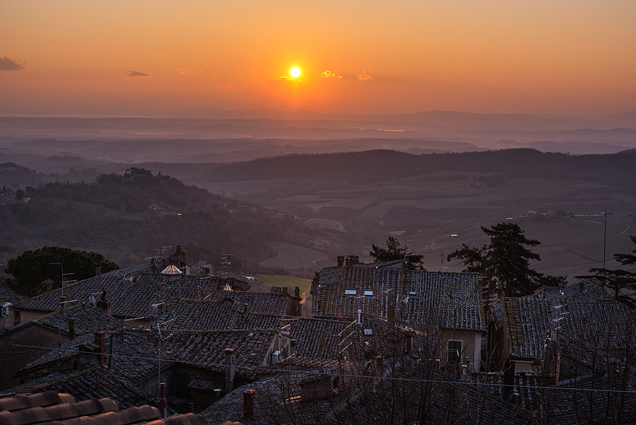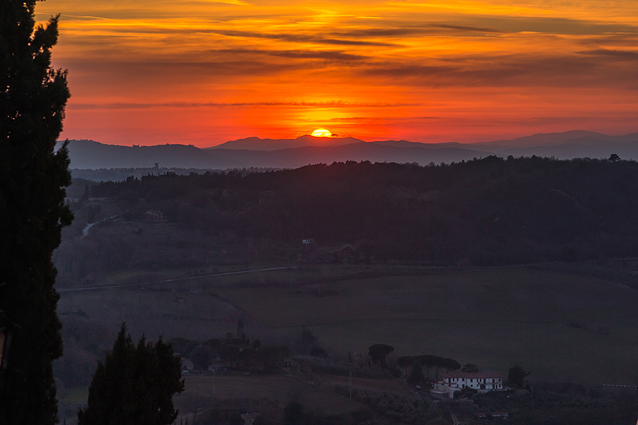 Grįžtant namo matau - mūsų kaime Montepulciano žmonės su telefais fotkina saulėlydį. Jis fantastiškas, tad ir aš verčiuos iš mašinos su visa įranga.